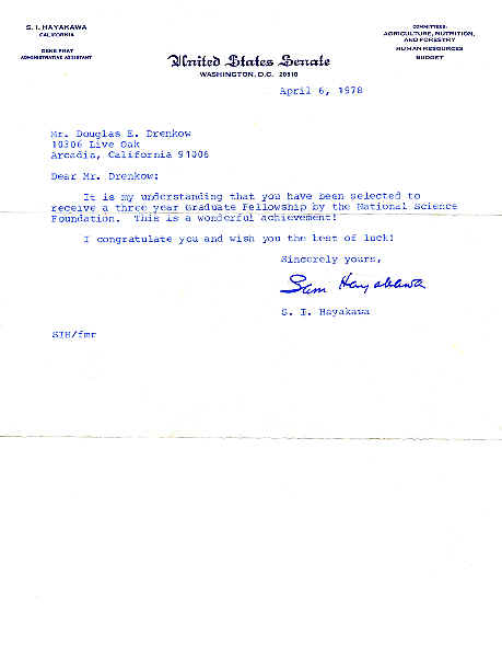 Congratulatory Letter from U.S. Senator Sam Hayakawa