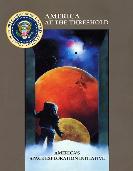 The purpose of the Outreach Program was to “cast a wide net” for innovative ideas throughout the country. Those who chose to respond to the direct mailings, mass advertising, and other outreach methods included everyone from members of the American Institute of Aeronautics and Astronautics to everyday citizens, including some schoolkids who were just space buffs. All of the ideas submitted, in a strictly designated format, were systematically catalogued, reviewed, and ultimately integrated by a Synthesis Group, composed of military, other government, academic, and industry experts. The final report, America at the Threshold, was presented to the president in May of 1991.